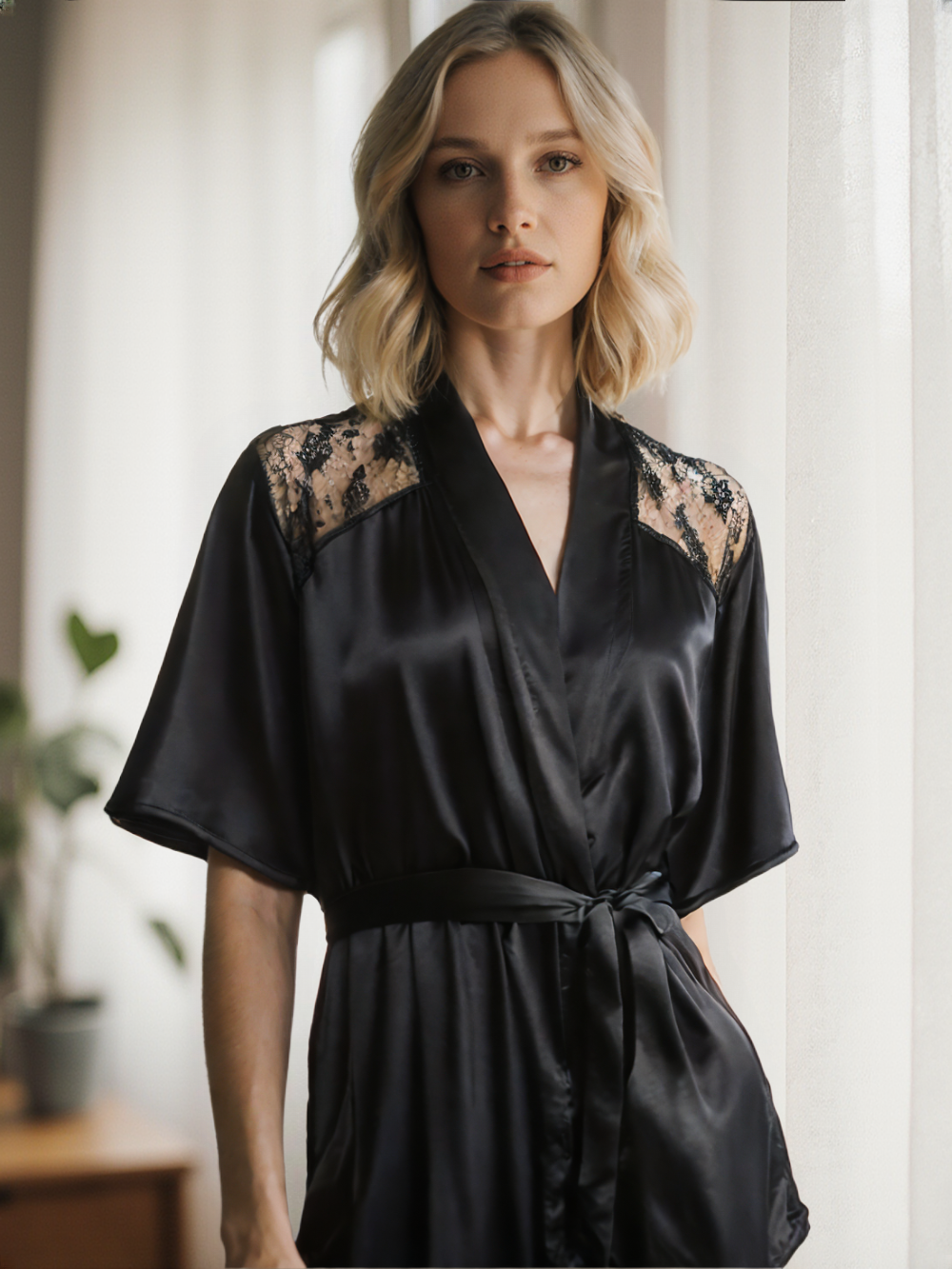 Le luxe à fleur de peau. Ce peignoir court en satin soyeux est l'incarnation même du glamour et de la sophistication. Ses empiècements en dentelle florale délicate au dos et sur les épaules créent un jeu de transparence envoûtant, idéal pour sublimer vos moments de détente avec une élégance royale.
